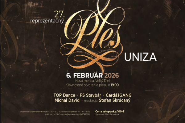 Srdečne vás pozývame na 27. reprezentačný ples UNIZA, ktorý sa uskutoční 6. februára 2026 o 19:00 na...